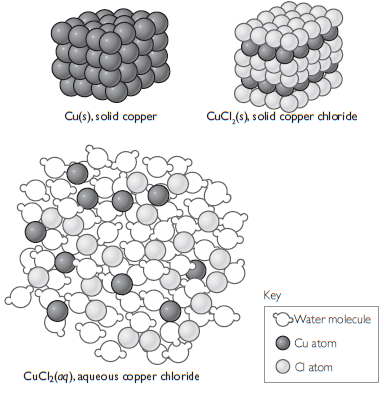 These drawings are models that show solid copper, solid copper chloride and aqueous copper chloride as collections of atoms. 1. Describe each model. 2. What is similar about each model? What is different?